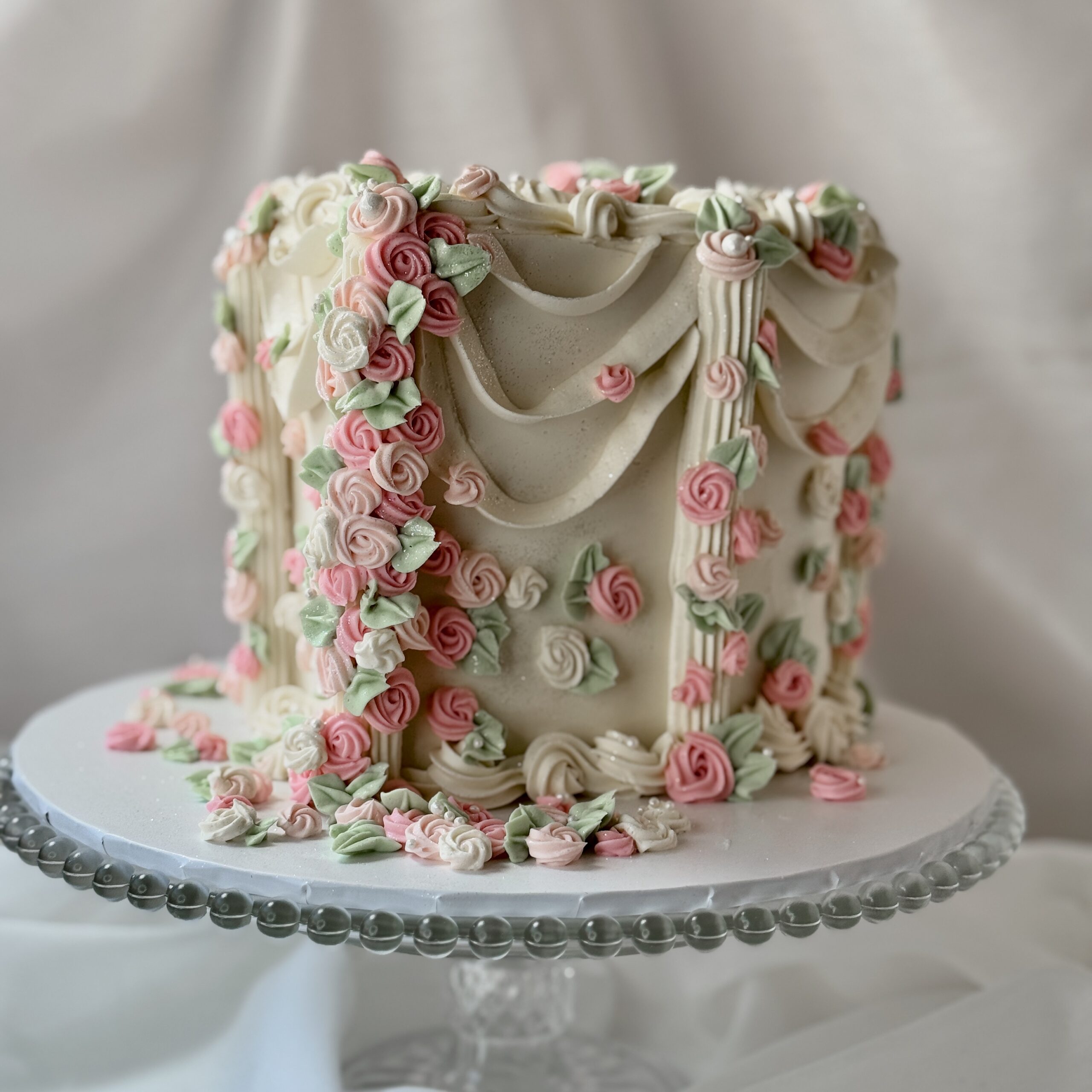 This romantic cake is a cascade of vintage charm. Adorned with hand-piped buttercream roses in soft pastels and creams, delicate green leaves, and elegant swags, it’s finished with a dusting of edible shimmer for a subtle sparkle (add on). Perfect for weddings, anniversaries, bridal showers, or any celebration where love takes center stage.