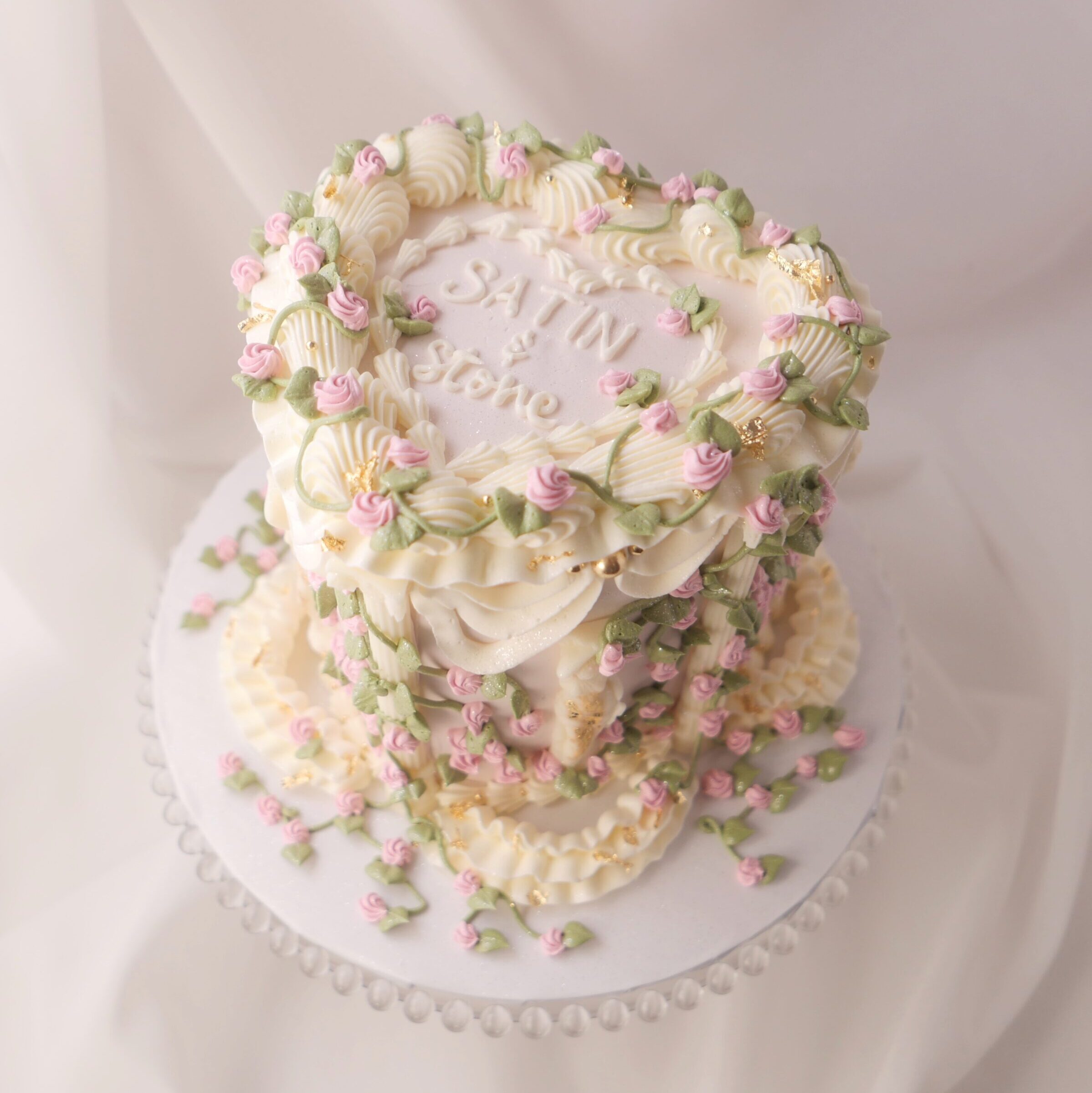 This cake is a celebration of creativity and vintage charm. This ode to a vintage summer garden is adorned with cascading buttercream vines, delicate pastel florals, and glimmers of gold leaf.