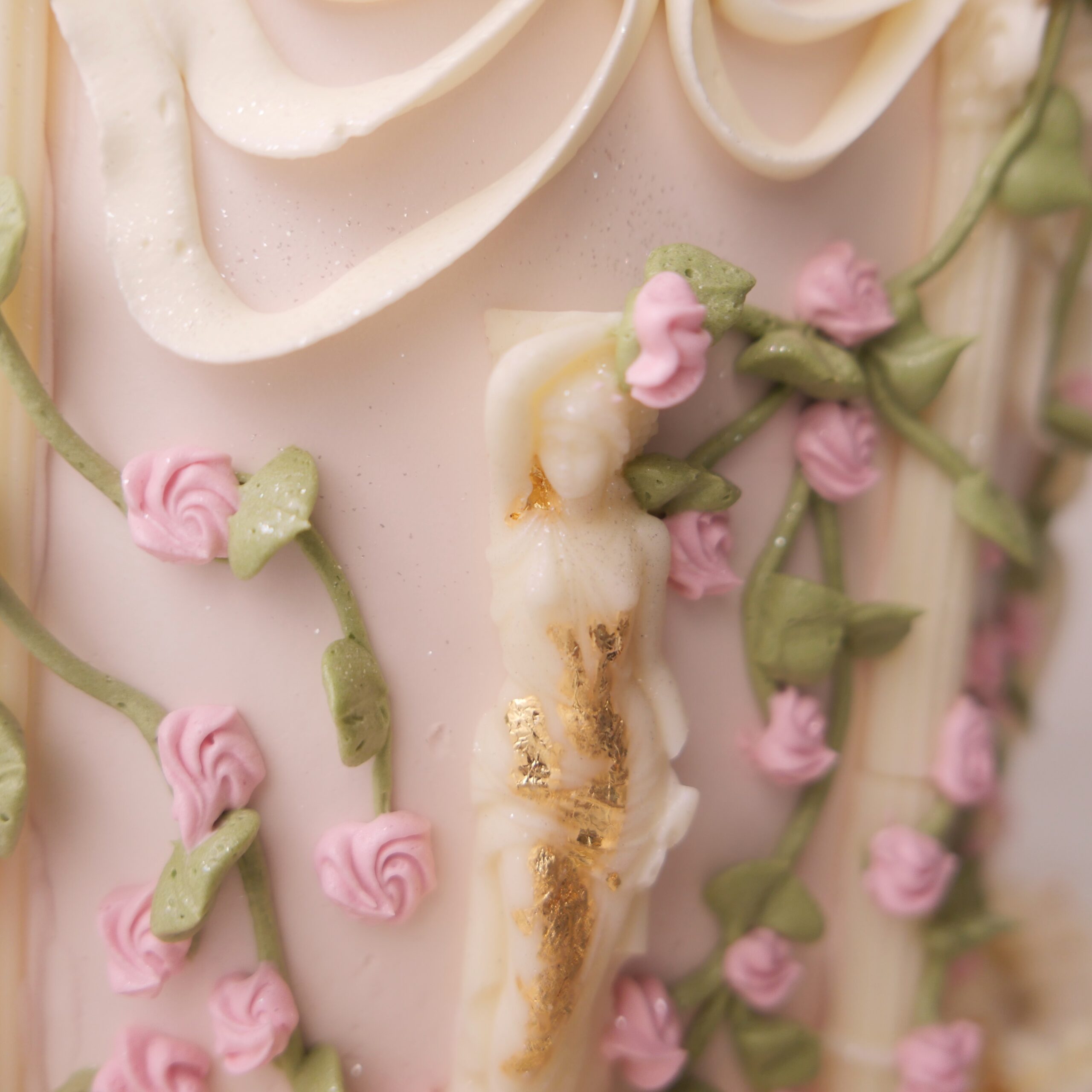 Edible chocolate statues add a touch of luxury to the design. The photo featured has light pink rosettes. This cake comes with gold sprinkles/pearls, gold leaf, full cake luster dust and edible gold leaf chocolate statues.