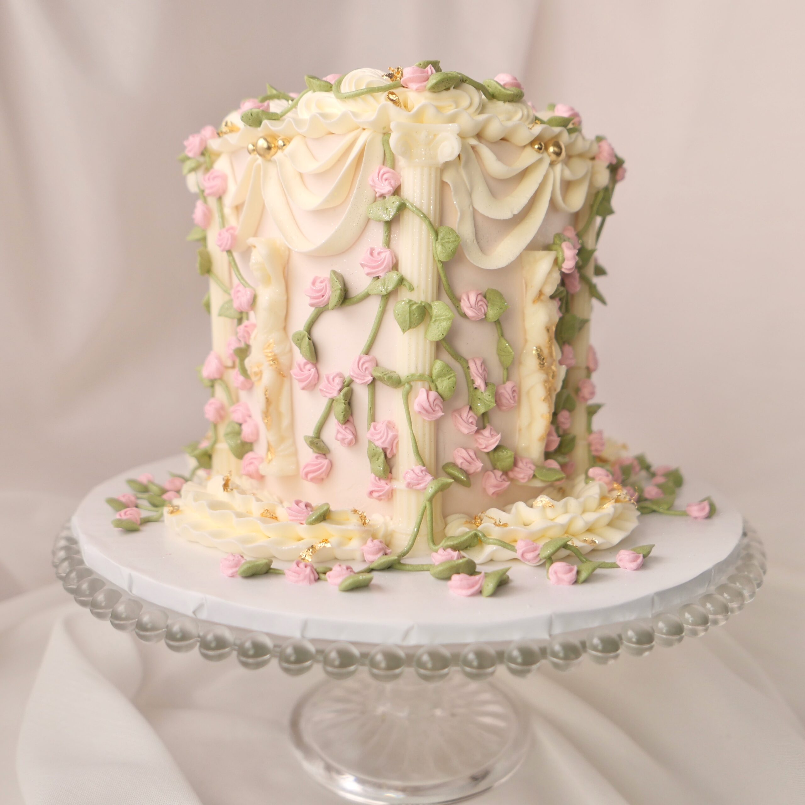 This cake is a celebration of creativity and vintage charm. This ode to a vintage summer garden is adorned with cascading buttercream vines, delicate pastel florals, and glimmers of gold leaf.